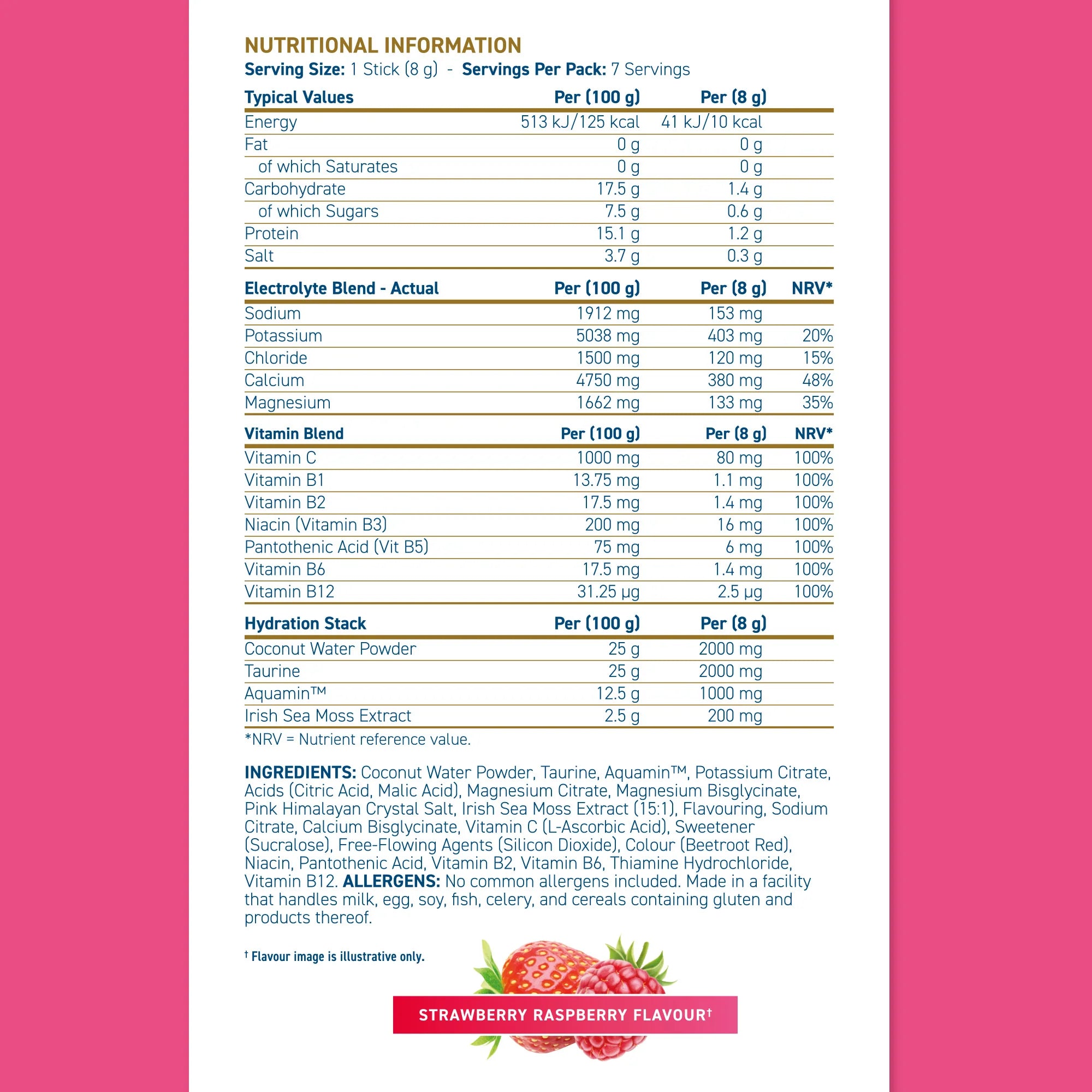 ЯГОДА И МАЛИНА: Кокосов прах, Таурин, Аквамин™, Калиев цитрат, Киселини (лимонена киселина, ябълчена киселина), Магнезиев цитрат, Магнезиев бисглицинат, Розова хималайска кристална сол, Екстракт от ирландски морски мъх (15:1), Аромат, Натриев цитрат, Калциев бисглицинат, Витамин C (L-аскорбинова киселина), Подсладител (Сукралоза), Смесители за по-течна консистенция (Силициев диоксид), Оцветител (червено цвекло), Ниацин, Пантотенова киселина, Витамин B2, Витамин B6, Витамин B1, Витамин B12.